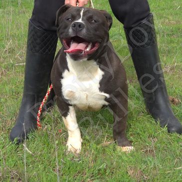 6MO as of 4-3-25 and already has grown dog features. Probably the best female produced in this litter. She thick, short and easy handling. Message me for more pictures or a video call